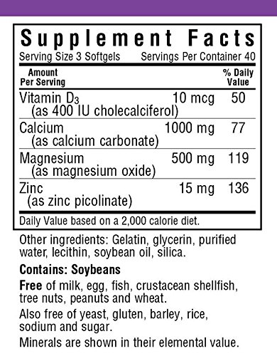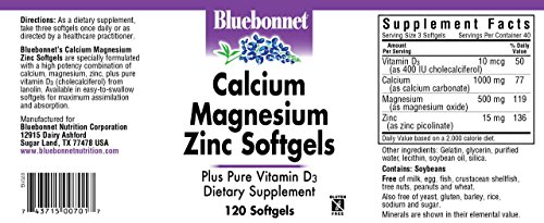 Bluebonnet's Calcium Magnesium Plus Zinc helps support optimal bone health. May help reduce the risk of osteoporosis, and helps support healthy muscle contraction. These softgels are specially formulated with a high potency combination of calcium, magnesium, zinc, copper, and boron. Plus L-glutamic acid and horsetail powder. Available in easy-to-swallow softgels for maximum assimilation and absorption.Feature