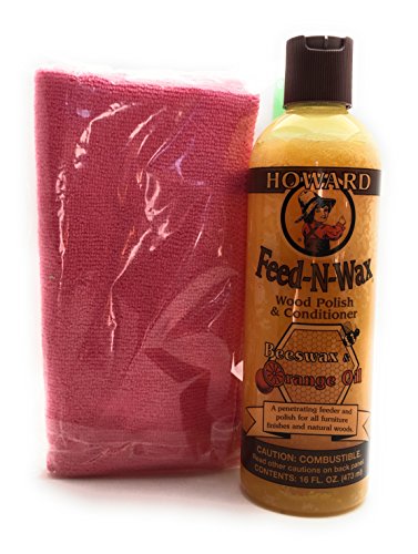 -. Brand : COMBO -. Feature : Contains a unique blend of beeswax, carnauba wax, and orange oil that is all natural and made in the USA. / Polishes wood to a soft luster and coats the wood with natural wax that continues to protect. / Enhances the natural beauty and depth of grain in finished and unfinished woods. / Prevents further drying and deterioration of wood. / Comes with a 14" x 16" microfiber cloth, made by Greenbriar International, to apply and polish for a beautiful shine. -. Label : Combo -. Manufacturer : Combo -. ProductGroup : Kitchen -. ProductTypeName : KITCHEN -. Publisher : Combo -. Studio : Combo -. Title : Howard Feed-N-Wax All Natural Wood Polish and Conditioner with Microfiber Cloth