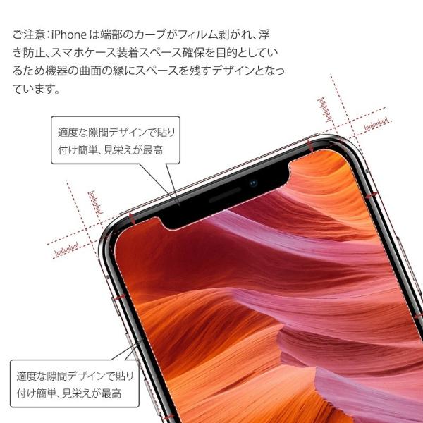 (1)iPhone 専用設計 iPhoneは端部のカーブがフィルム剥がれ、浮き防止、スマホケース装着スペース確保を目的としているため機器の曲面の縁にスペースを残すデザインとなっています。