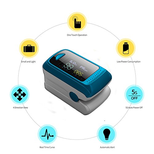 4.Self-adjusting finger clamp plus simple one-button design allows for easy operation. Small portable size makes it easy to handle and carry. Helpful for athletes and pilots to obtain quick and accurate oxygen saturation readings.