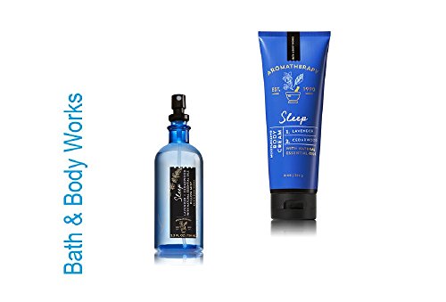 -. Binding : Misc. -. Brand : Bath & Body Works -. EAN : 0643845801762 -. Feature : Aromatherapy - Lavender & Cedarwood - Pillow Mist & Body Cream - Gift Set / Key Fragrance Notes:Lavender Essential Oil inspires tranquility. Cedarwood Essential Oil helps calm the mind. / Body Cream - 8 oz. - $15.50 - Ultra-rich, ultra-pampering body cream deeply nourishes skin with protective 24-hour moisture, while an aromatherapy blend of essential oils soothes body, mind & mood. Breathe deeply for best results. / sleep - Lavender & Cedarwood Pillow Mist - 5.3 fl oz - Spray a light mist over linens before bedtime to ease your mind. Allow fabric to dry P.R.Ior to contact. Breathe deeply for best results. -. IsAdultProduct : 0 -. Label : Bath & Body Works -. Manufacturer : Bath & Body Works -. MPN : ALVES2 -. PackageQuantity : 2 -. PartNumber : ALVES2 -. ProductGroup : Beauty -. ProductTypeName : BEAUTY -. Publisher : Bath & Body Works -. Studio : Bath & Body Works -. Title : Bath & Body Works - Aromatherapy - Sleep - Lavender & Cedarwood - Pillow Mist & Body Cream - Gift Set -. UPC : 643845801762