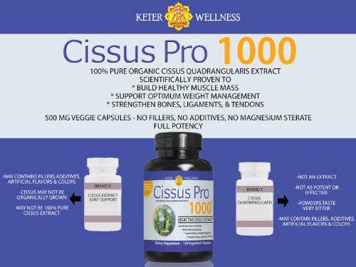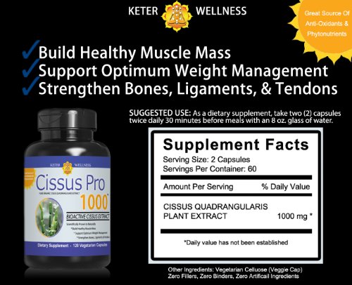 -. Binding : Health and Beauty -. Brand : Keter Wellness -. EAN : 0757901820670 -. Feature : Made in USA. Cissus Pro 1000 is made in a certified GMP USA facility where it is tested for purity and potency. / All Natural. Cissus Pro contains no artificial, toxic ingredients and is 100% vegetarian. The naturally grown Cissus quadrangularis plant material is extracted leaving a high-potency powder extract. / Cissus Pro Benefits: Cissus Pro 1000 Promotes Healthy Bone Structure, Supports Joint, Ligament, and Tendon Function. Cissus Supports the Body to Maintain Lower Cortisol Levels. / Full 1 Month Supply. Each bottle contains 60 servings to be taken twice a day. That is providing 2000 mg of Cissus quadrangularis extract per day. / Keter Wellness Guarantee. We are so sure you will find this to be the highest quality Cissus quadrangularis product that we guarantee for 30 days. -. Label : Keter Wellness -. Manufacturer : Keter Wellness -. MPN : 1 -. PackageQuantity : 120 -. PartNumber : 1 -. ProductGroup : Health and Beauty -. ProductTypeName : HEALTH_PERSONAL_CARE -. Publisher : Keter Wellness -. Studio : Keter Wellness -. Title : Cissus Pro 1000 | Made in USA | Pure Cissus quadrangularis Extract | 120 Vegetarian Capsules -. UPC : 757901820670