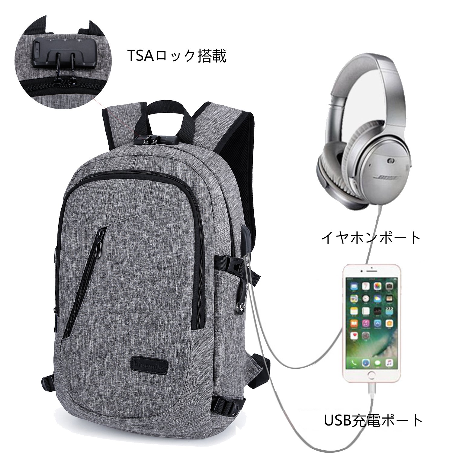 I am looking forward to traveling, there is a TSA lock mounted, install externally through hole for USB port · earphone cable, let's go out comfortably.