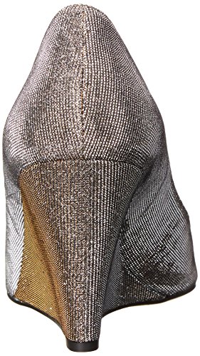 Metallic fabric pump featuring open toe and wedge heel