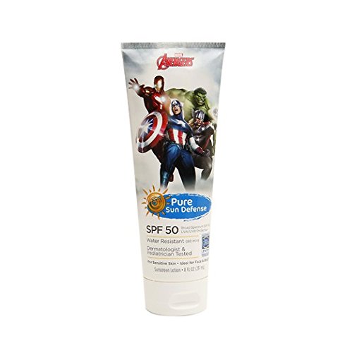 Sunscreen is better with friends. Pure Sun Defense has partnered with the world(')s largest movie studios to protect your children(')s skin while also bringing fun and engagement into the category. Pure Sun Defense Marvel Avengers Sunscreen Lotion is a dermatologist and pediatrician tested, fragrance-free, and hypoallergenic formula that is ideal for children(')s sensitive skin. With SPF 50, this moisturizing sunscreen lotion is water resistant for up to 80 minutes, providing broad spectrum UVA/UVB protection to help prevent sunburn.Feature