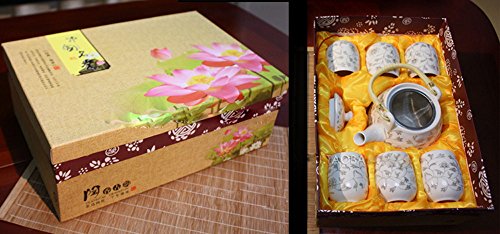 -. Feature : Feature ------ China Jin De Zhen ceramic, 7-pieces tea set with one loop-handled teapot and six teacups, outline in gold design / Functions ------ Chinese traditional tea cup / Material ------ high grade and white porcelain / Product Size ------ 16*12cm(1000ml) for teapot, 7.5*6cm(180ml) for teacups, pls refer to the size marked on the photo in details. / Color ------ white and golden