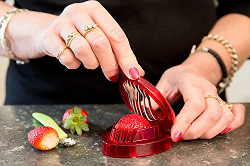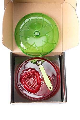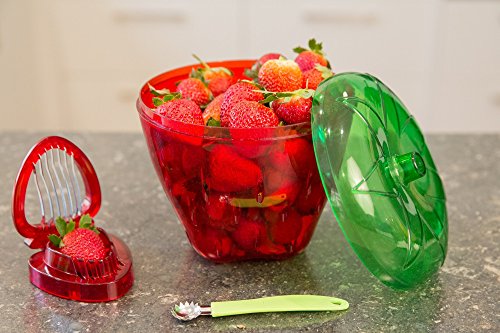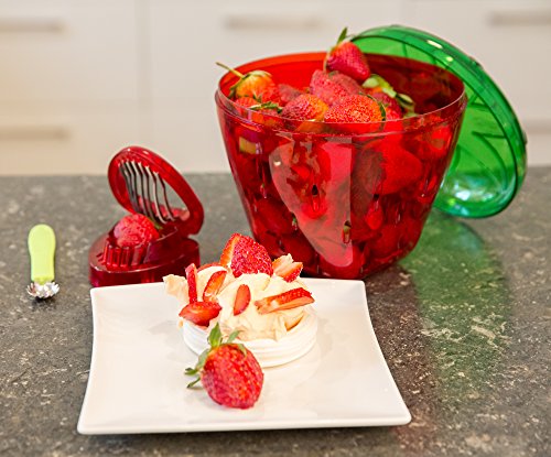 - Makes a Great Gift Red Strawberry Shaped Container/Keeper 6.75 X 6.75 X 6.75 inches with Green lock tight lid, Holds 3 Punnets/Trays.Huller and Slicer, Gadgets Fit Cleverly into a solid plastic Insert - Inside the Container for smart Easy Storage.