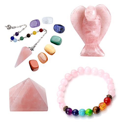 - Healing Crystal Kit includes 1pc Rose Quartz Angel,1pc Chakra Pendulum,7pcs Chakra Stones,1pc Rose Quartz Pyramid,1 pc Chakra Bracelet,comes with beautiful box as gift.