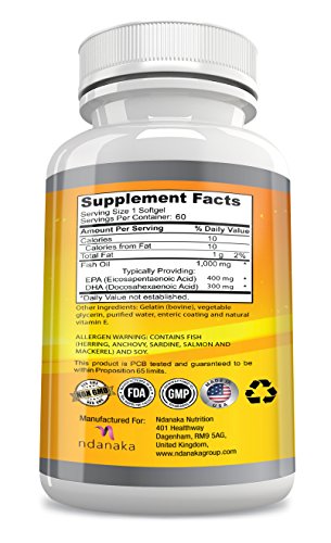 -. Feature : NO-FISHY AFTERTASTE: Our Omega 3 fish oil softgel capsules have an enteric coating to help increase your absorption of the essential fatty acids and avoid fishy aftertaste. Enjoy Health Benefits Without Fish Burps! / HIGH QUALITY: 1,000 mg Fish Oil with 1,000 mg Omega-3 Fatty Acids (120 mg DHA, 180 mg EPA) per serving (1 caps). 100% Satisfaction Guarantee. / GREAT HEALTH BENEFITS: Fish oil supports heart heath, brain health, joints, mood & mental state, skin & hair. / SAFE and EFFECTIVE: Perfect for men, women, adults, and kids. Non GMO. Gluten Free. No artificial colors; No artificial flavors; No artificial preservatives. Made in the USA. / A PERFECT DIETARY COMPLIMENT FOR: weight loss, bodybuilding, reducing inflammation, a slim waist, and optimum nutrition. Fish oil pills that go well with multi-vitamins, vitamin d and d3, coq10, resveratrol, zinc, and vitamin e.