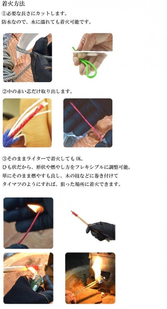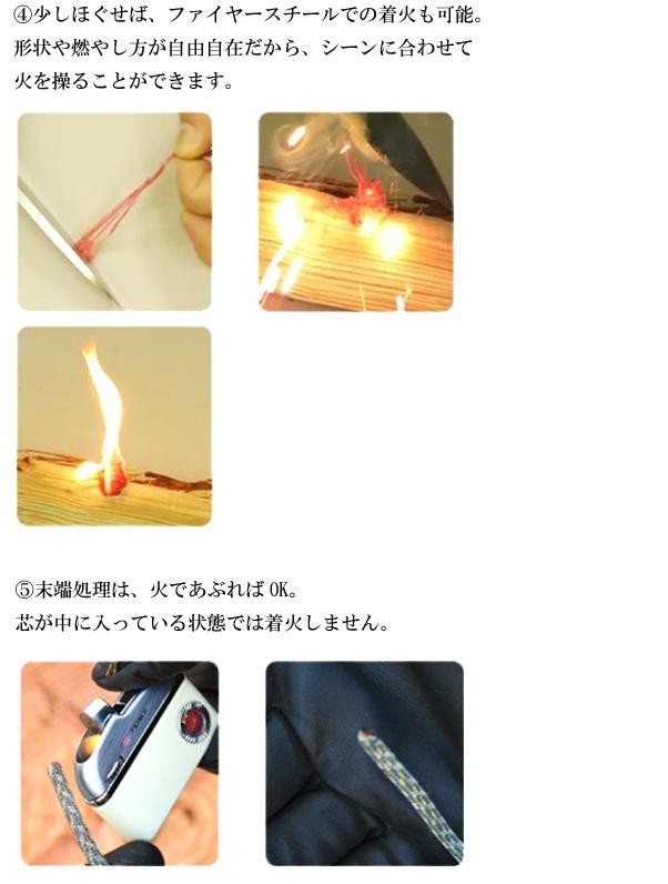 | 紐の一部を解き外側部分を剥くと、中から可燃性の紐が出てきます。この可燃紐を燃やすことで緊急時に火種として使えます。火口が見つからなくとも火熾しができ、サバイバルはもちろん防災にも役立ちます。 |