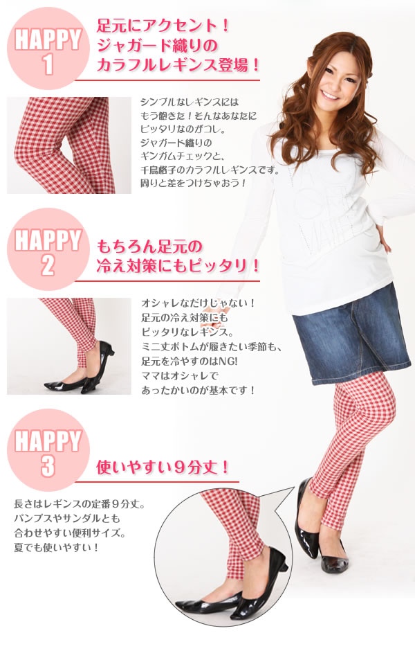足元をポップに彩ってくれそうなジャガード織りの9分丈レギンス。ギンガムチェックと千鳥格子の2種類をご用意しました。使いやすい9分丈は夏でも活躍してくれそう♪