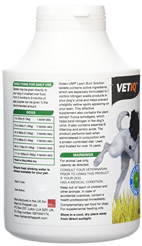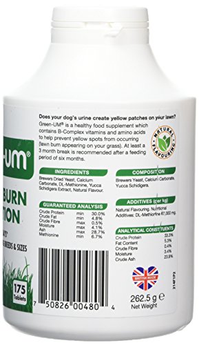 -. Binding : Target -. Brand : Mark And Chappell Ltd -. EAN : 0750826004804 -. Feature : Helps prevent yellow lawn burn patches caused by dog urine / 1 tablet strength suits all dog breeds and sizes / Veterinary formulation - veterinary approved / Safe for pets and lawns / Trusted and used by pet owners worldwide -. IsAdultProduct : 0 -. Label : Mark And Chappell Ltd -. Manufacturer : Mark And Chappell Ltd -. MPN : 4804 -. PackageQuantity : 1 -. PartNumber : 4804 -. ProductGroup : Pet Products -. ProductTypeName : PET_SUPPLIES -. Publisher : Mark And Chappell Ltd -. Studio : Mark And Chappell Ltd -. Title : M&C Dog Green-Um Lawn Burn Control 175 Tablets -. UPC : 750826004804