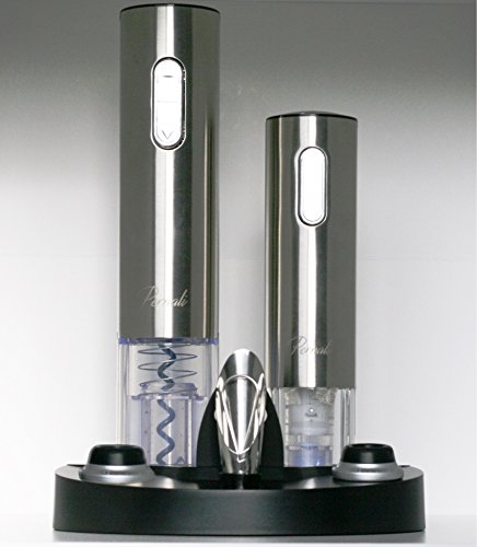 All-in-one design set with everything desired for beginner and experienced wine connoisseurs alike! High quality sleek sophisticated design with high quality stainless steel finishes and blue LED charging base with power cord. Sleek and stylish electric wine opener effortlessly extracts corks from up to 30 bottles on a single charge; simple push-button operation with see-through extraction window. Coordinating electric vacuum wine pump preserver automatically removes the air and seals opened wine bottles to retain freshness with simple push button design. The set includes two integrated stoppers with date setting function. Premium pourer with easy pour design. Included foil cutter easily removes sealed wine tops. Get the set everyone is talking about today!!!Feature