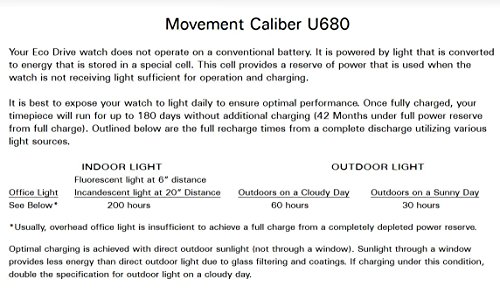-. Feature : Eco-Drive is fueled by light so it never needs a battery / Silver tone stainless steel bracelet with black dial / Multi-Function Chronograph / Anti-Reflective Min Crystal / Water resistant to 660 feet (200 M): suitable for recreational scuba diving