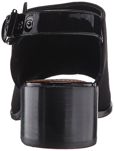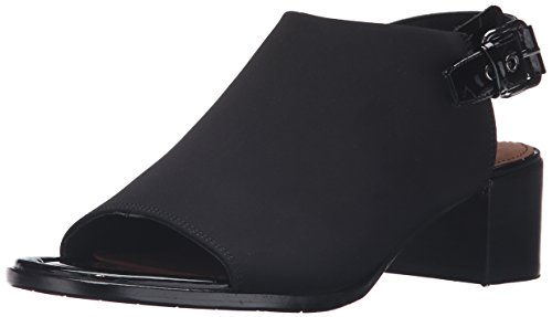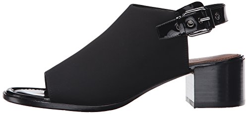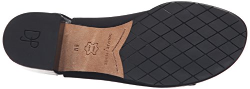 Donald j pliner mazie sandal. upper is combination of crepe elastic and patent leather (ankle strap). ankle strap has an adjustable buckle. 2 inch block heel. heel is stacked, polished leather. outsole is leather with rubber forepart.Feature