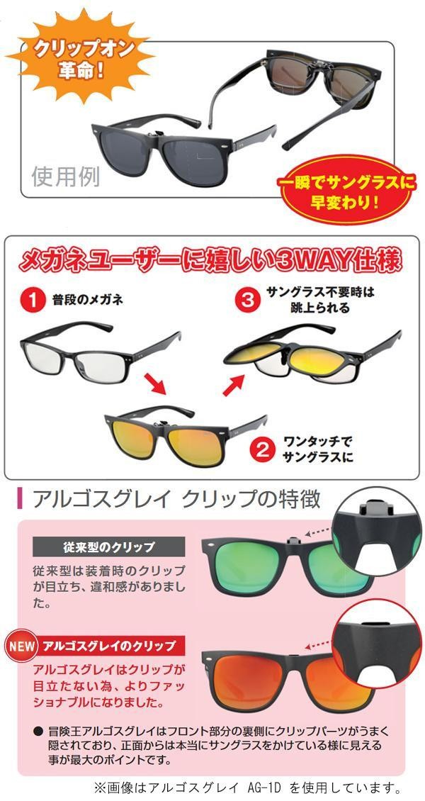 | メガネの上からワンタッチで装着できるサングラス!!紫外線も99%カットでき、アウトドア全般で活躍します♪弾力性と軽さが特徴のTR-90素材を使用しており、10gを切る超軽量を実現しました。 |
