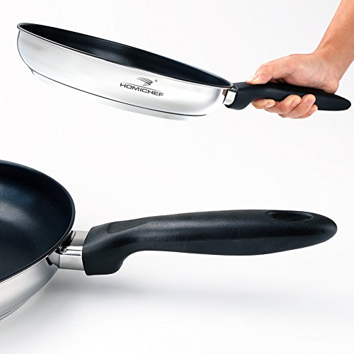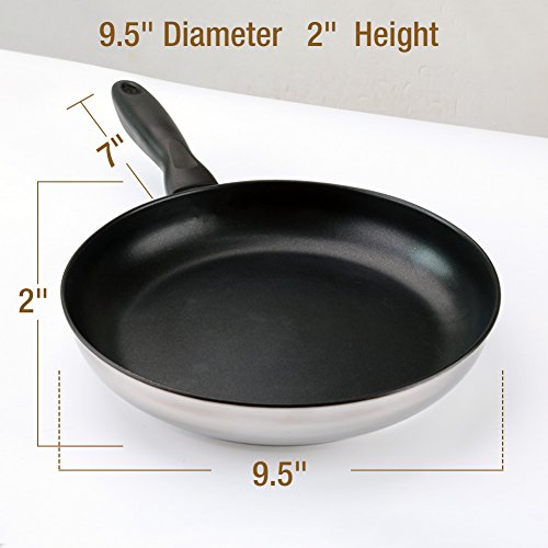 MIRROR POLISHED & DURABLE NONSTICK COATING - This 9.5" stainless steel nonstick pan is noble & elegant: polished exterior has a gleaming, mirror-like finish; black interior works well with a black bakelite handle, cutting a fine figure in the kitchen - PFOA-FREE nonstick coatings won't crack, peel or break down, safe enough to keep food from sticking & require little or no oil for low-fat cooking - Perfect for flipping pancakes, turning sausages, searing steaks, or browning & frying foods.