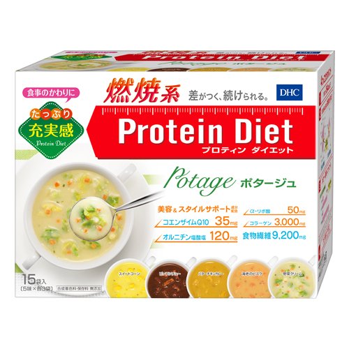 -. Feature : 【全5味】あったかポタージュでおきかえダイエット!1食あたり154kcal以下 / 15袋入(5味×各3袋) / DHCプロティンダイエットポタージュ1袋あたり【5味共通の栄養成分】オルニチン塩酸塩120mg、コエンザイムQ10 35mg、α-リポ酸50mg、コラーゲン3,000mg、カルシウム438mg、鉄3.3mg、亜鉛3mg、銅0.3mg、マグネシウム164mg、ビタミンA 426μg、ナイアシン17mg、パントテン酸4.3mg、ビタミンB2 0.9mg、ビタミンB6 1.4mg、ビタミンB12 2.6μg、ビタミンC 74mg、ビタミンD 1.9μg、ビタミンE 7.9mg、葉酸187μg 【野菜クリーム】1袋37.2gあたり、ビタミンB1 1.2mg、たんぱく質13.8g、脂質3.0g、糖質9.3g、食物繊維9.9g、ナトリウム800mg、食塩相当量2.0g、熱量132kcal 【スイートコーン】1袋39.4gあたり、ビタミンB1 1.2mg、たんぱく質13.8g、脂質1.5g、糖質12.7g、食物繊維10.0g、ナトリウム1.0g、食塩相当量2.5g、熱量132kcal 【ビーフシチュー】1袋41.7gあたり、ビタミンB1 6.2mg、たんぱく質14.6g、脂質4.3g、糖質10.5g、食物繊維11.3g、ナトリウム900mg、食塩相当量2.3g、熱量154kcal 【バターチキンカレー】1袋41.4gあたり、ビタミンB1 1.2mg、たんぱく質14.6g、脂質4.1g、糖質10.1g、食物繊維10.1g、ナトリウム1.2g、食塩相当量3.0g、熱量148kcal 【海老のビスク】1袋37gあたり、ビタミンB1 1.2mg、たんぱく質15.2g、脂質2.0g、糖質8.6g、食物繊維9.2g、ナトリウム1.0g、食塩相当量2.5g、熱量124kcal / 【5味共通の原材料】難消化性デキストリン、脱脂濃縮乳、乳蛋白濃縮物、鶏肉、ソテーオニオン、砂糖、コラーゲンペプチド、でん粉、ドロマイト、酵母エキス、オルニチン塩酸塩、コエンザイムQ10、チオクト酸(α-リポ酸)、パン酵母、調味料(アミノ酸等)、増粘剤(キサンタンガム)、V.C、トリプトファン、メチオニン、クエン酸第一鉄ナトリウム、V.E、ナイアシン、酸化防止剤(ビタミンE)、パントテン酸Ca、V.B1、V.B6、V.B2、V.A、葉酸、V.D、V.B12 【野菜クリーム】じゃがいも、人参、粉末コンソメ、パーム油、野菜ペースト、チキンパウダー、乾燥キャベツ、オニオンパウダー、胡椒、パセリ(乳、小麦、大豆、鶏肉、ゼラチンを含む) 【スイートコーン】スイートコーンパウダー、乾燥スイートコーン、食塩、野菜ブイヨン、チキンパウダー、胡椒、パセリ、クチナシ色素、香料(小麦、大豆、ゼラチンを含む) 【ビーフシチュー】ビーフ香味調味料、ウスターソース、牛肉、トマトペースト、野菜ペースト、デミグラスソース、乾燥マッシュルーム、食塩、胡椒、パセリ、カラメル色素、香料(乳、小麦、牛肉、大豆、鶏肉、豚肉、ゼラチンを含む) / 【バターチキンカレー】トマトペースト、乳又は乳製品を主要原料とする食品、チキンパウダー、バター、にんにく、生姜、食塩、オニオンパウダー、カレーパウダー、野菜ペースト、乾燥鶏肉加工品、ガラムマサラ、胡椒、唐辛子末、酸味料、加工デンプン、香料、重曹(小麦、卵、大豆、ゼラチンを含む) 【海老のビスク】オキアミペースト、えび、トマトペースト、乳又は乳製品を主要原料とする食品、野菜ペースト、食塩、チキンパウダー、プロセスチーズ(チェダーチーズ加工品s)、ブランデー、パセリ、パプリカ色素、香料、カラメル色素(小麦、大豆、ゼラチンを含む)