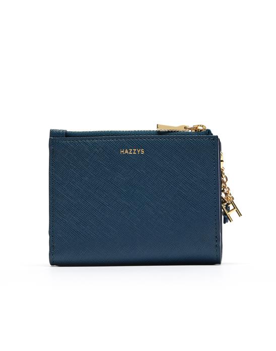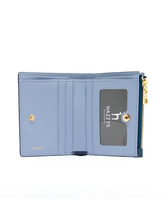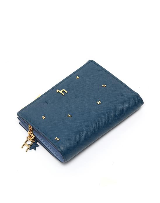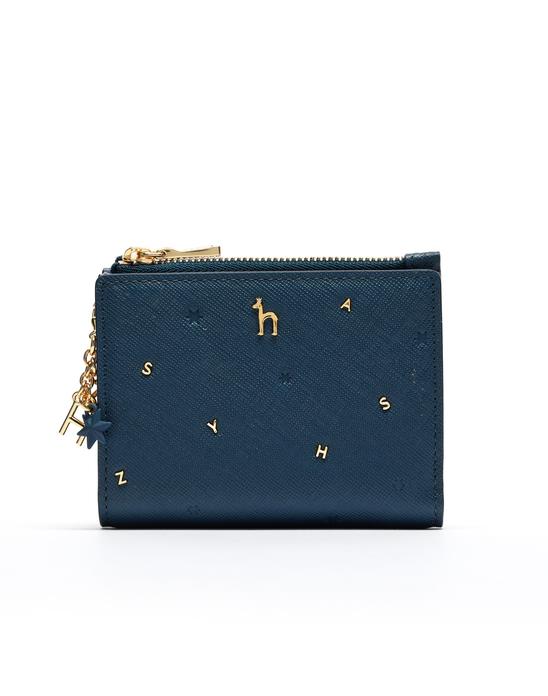 로고 모티브의 골드 금속 장식과 음각 장식으로 포인트를 준 반지갑입니다.