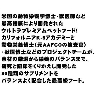 原材料:新鮮な鶏肉・玄米・ラムミール(乾燥肉)・オートミール・大麦・ダックミール(乾燥肉)・ポテト・ニンジン・鶏脂肪(混合トコフェロールで酸化防止)・トマト・自然風味・キャノーラオイル・ビールイースト・サーモンミール・サーモンオイル