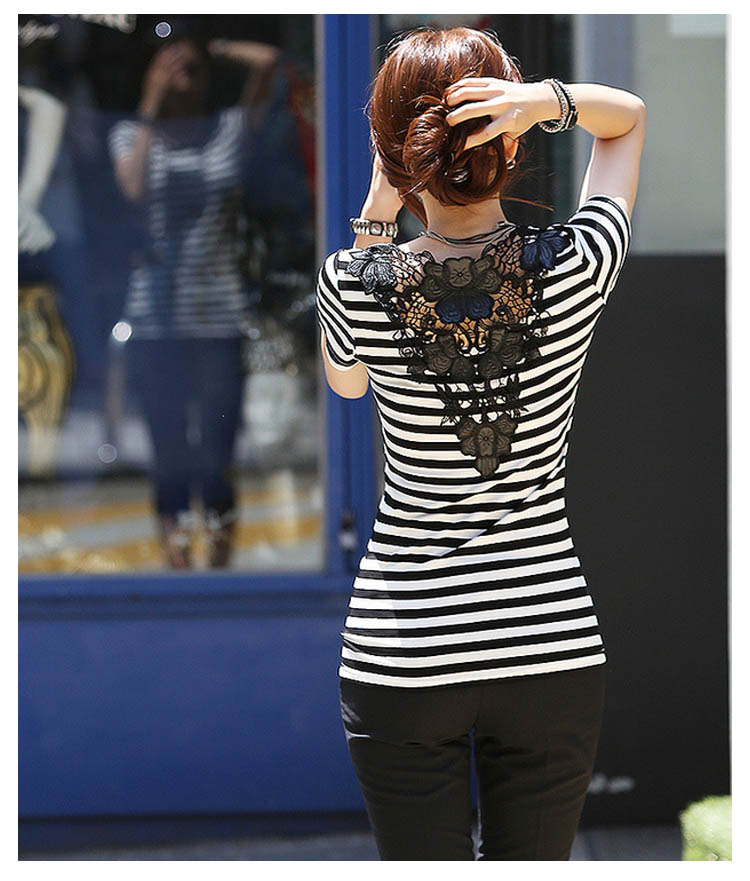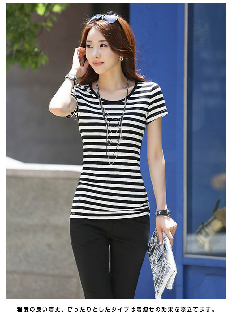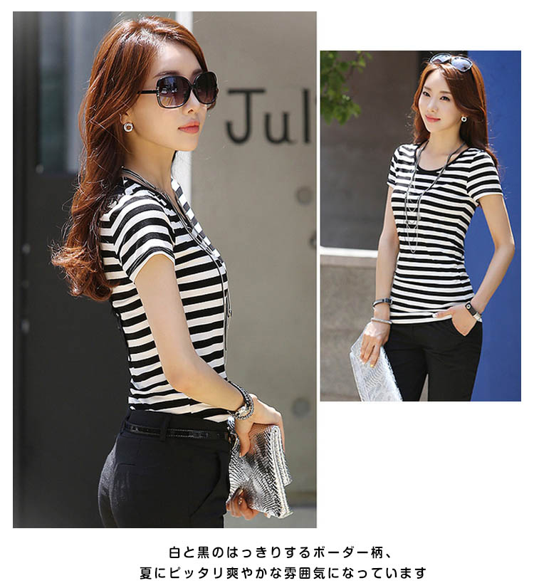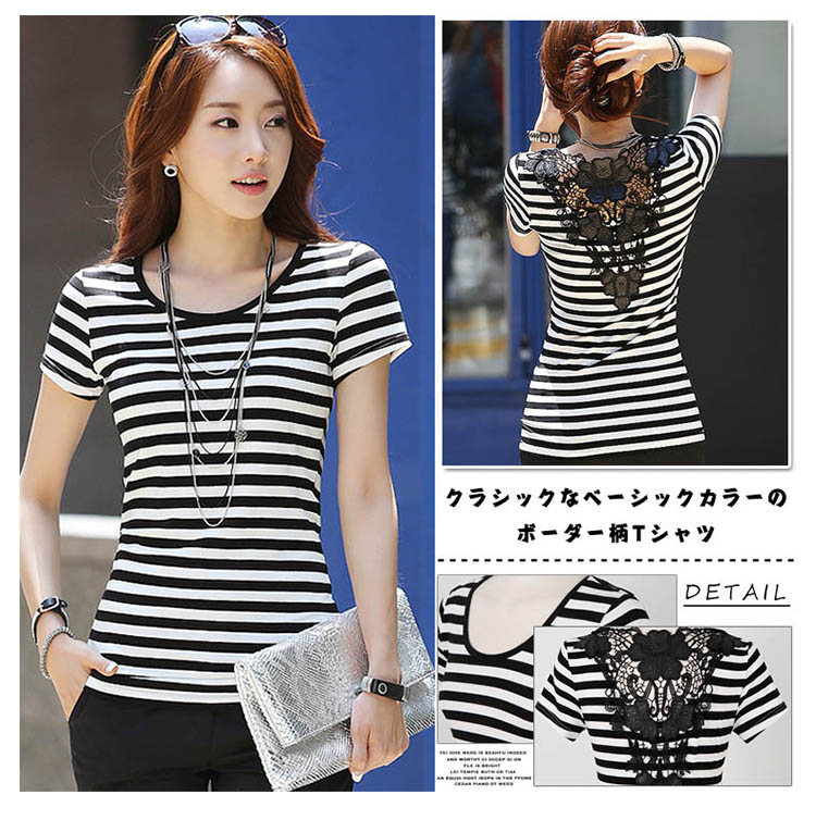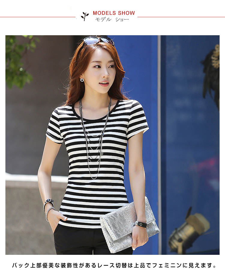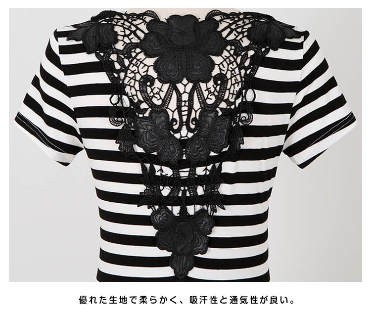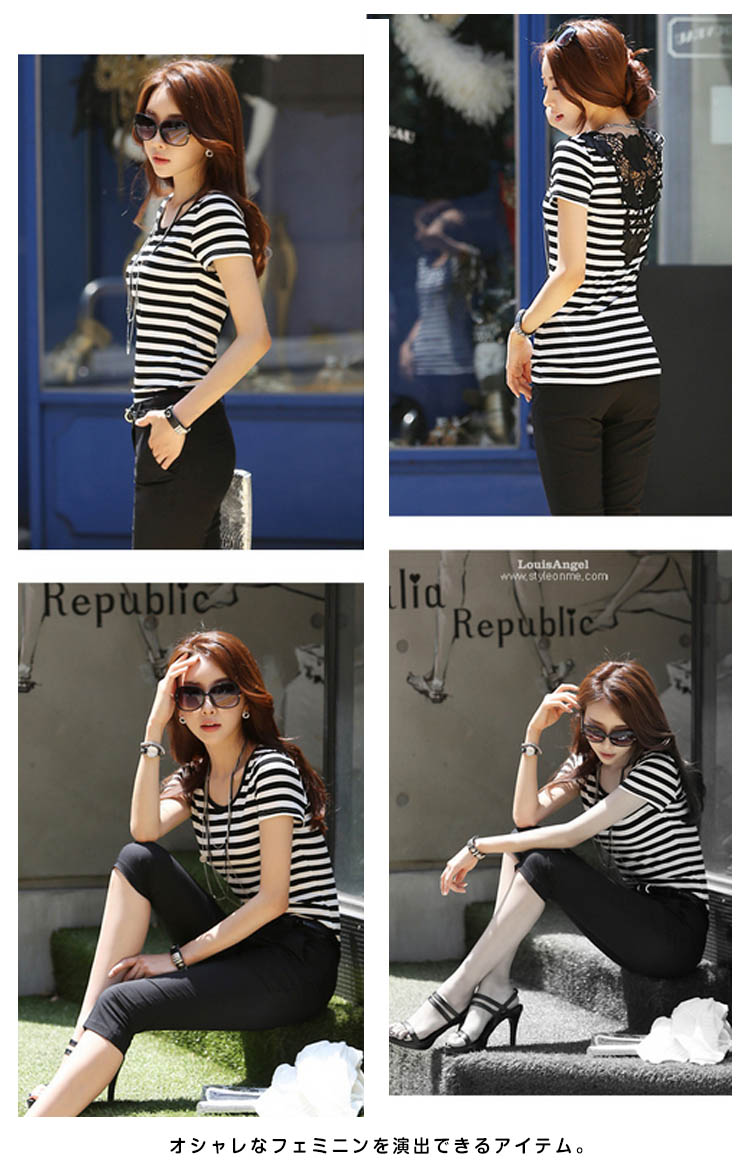 | クラシックなベーシックカラーのボーダー柄Tシャツ。バック上部優美な装飾性があるレース切替は上品でフェミニンに見えます。白と黒のはっきりするボーダー柄、夏にピッタリ爽やかな雰囲気になっています程度の良い着丈、ぴったりとしたタイプは着痩せの効果を際立てます。オシャレなフェミニンを演出できるアイテム。 | |