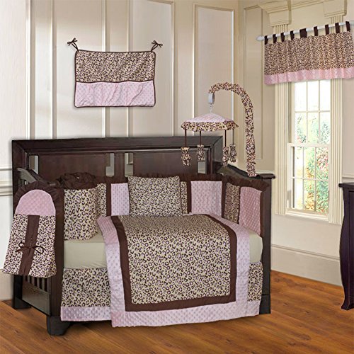-. Feature : This 10 piece crib bedding set features a beautiful mixture of pink minky dot chenille fabric along with a custom leopard P.R.Int on 100% natural cotton fabrics; this mix of premium fabrics and modern design bring together a style perfect for a baby girl nursery / Included in this 10 piece set are; quilt, bumper, fitted sheet, bed skirt, 2 window valances, toy bag, diaper stacker, decorative pillow and a matching musical mobile / The leopard P.R.Int contains shades of brown and pink; the border of the quilt is trimmed with 5.5" of ultra soft pink minky fabric; the quilt measures 36" x 45" which allows for several years of use before it is outgrown / The fitted sheet is fully elasticized for a snug fit and fits a standard sized 52" x 28" crib mattress; the fitted sheet is made from 100% cotton providing a gentle fabric next to baby's skin / Care instructions: Machine washable, tumble dry low, iron on low setting as required