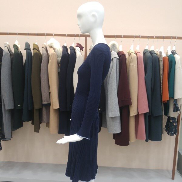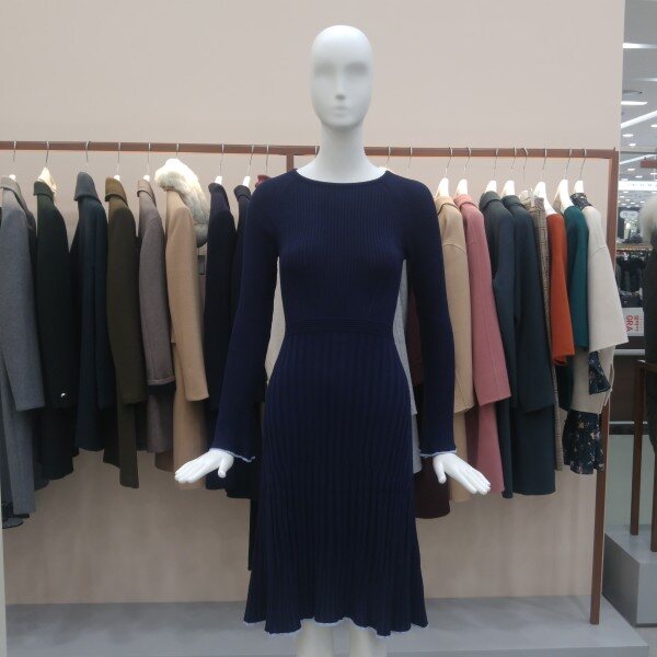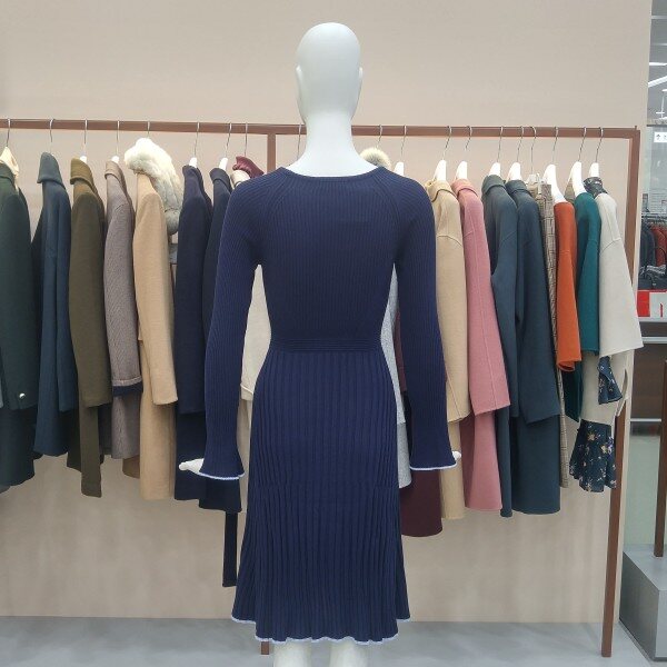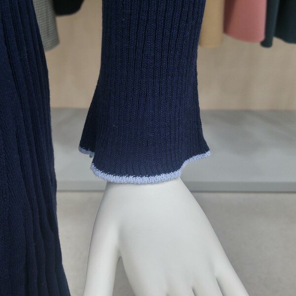 여성스러운 골지 니트원피스입니다. 소매끝단과 밑단끝단부분은 하늘색배색처리되었습니다.안감은 없으며 몸에 밀착되는 스타일입니다.