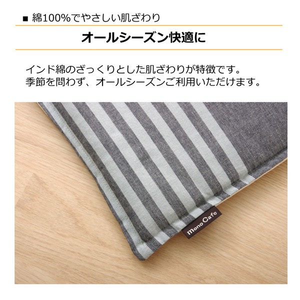 綿100%のクッションです。インド綿を使用しており、ざっくりとした肌触りが特徴です。お部屋の雰囲気を崩さず、どんなお部屋にもなじみやすい商品です。1つ置くだけでカジュアルでおしゃれなお部屋へと変身できます。