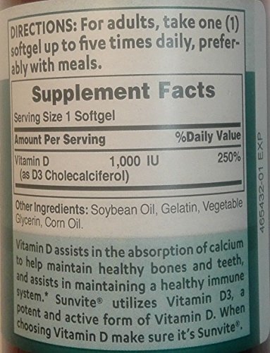 • Vitamin D3 contributes to bone health and density** • Supports immune system health** • Easy-to-swallow softgels Sunvite® utilizes Vitamin D3, a potent, active form of Vitamin D, and it's an essential vitamin for healthy bones and immune system wellness.** Vitamin D assists in the absorption of calcium to help maintain healthy bones and teeth, and assists in maintaining a healthy immune system.** If you use sunscreen products to protect the health of your skin (which you absolutely should), your body's natural production of vitamin D will be reduced. That's why taking a supplement like Sunvite® Vitamin D3 is a great way to make sure you're getting enough D every day!