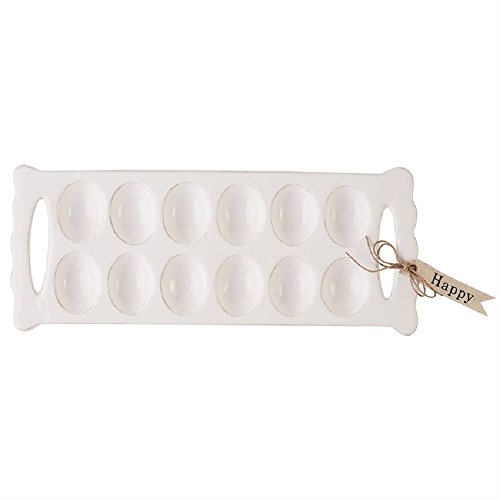 Studio : MP001 Publisher : MP001 Product Description Ceramic deviled egg tray holds a dozen eggs and features scalloped trim cut out handles and resist finish detail around edges. Tray arrives tied with jute twine tie and linen "Happy" tag. Size: 6 1/2" x 15 1/4" 0