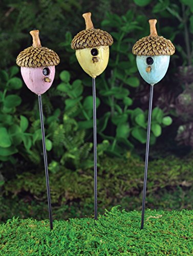 - A set of 3 little acorn look alike houses that are mini bird houses in pastel colors to accent your fairy garden greenery