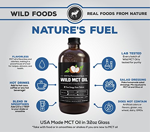 LARGE GLASS BOTTLE: Wild MCT comes in a huge 32oz amber glass bottle. It is Gluten-free, GMO-Free, GMP-Assured, and includes NO Fillers or Additives! It is made in the USA in a GMP facility from sustainable sources.
