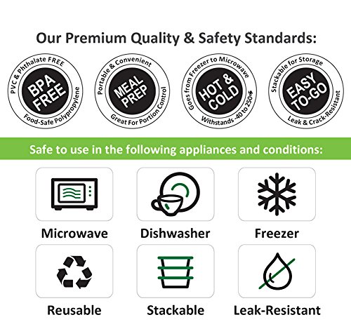 MICROWAVE, FREEZER AND DISHWASHER SAFE: Made of FDA Approved Premium Polypropylene (PP) and is 100% BPA FREE. The food container and airtight, leak resistant lid can withstand temperatures from -40 to 250 degrees Fahrenheit