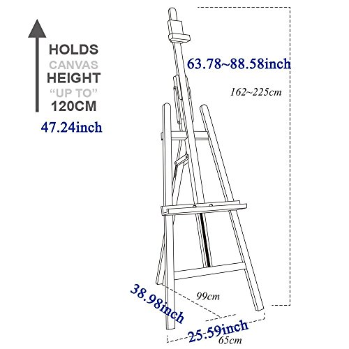 Folds flat for easy transport and storage.Holds canvas approx 47" high. Approx. Dimensions of Assembled Easel-width - 37 1/2", depth - 22", height- 94 1/2"