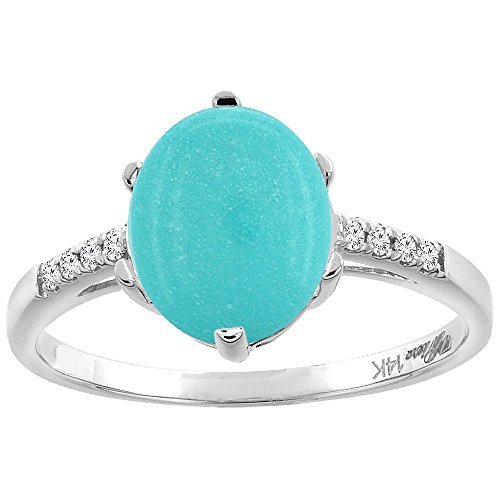 -. Binding : Jewelry -. Brand : Sabrina Silver -. Department : womens -. Feature : Solid 14K Gold / Naturally-vibrant, superior quality color gemstone / High quality, genuine diamond accents / Excellent quality and workmanship / Made in the USA -. ProductGroup : Jewelry -. ProductTypeName : FASHIONRING -. Title : 14K White Gold Natural Turquoise & Diamond Ring Oval 10x8 mm, sizes 5-10