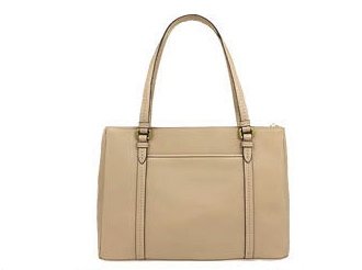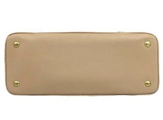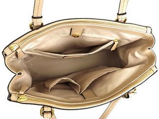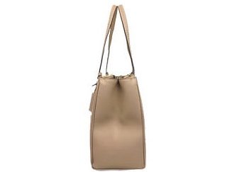 Wrapped in Coach's sand saffiano leather with brass tone hardware. This carryall features 3 main compartments - a center that has a magnetic closure and contains a zippered pocket and two open slip pockets. And then two outer compartments, each with a zippered top closure. The front is accented with Coach's logo lozenge on an open slip pocket. There's also an open slip pocket on the back. The bottom has four brass tone 'feet' to help protect the bottom of your bag. There are dual leather and brass straps with a drop of about 8". Measures approximately 12" (L) x 9" (H) x 5.5" (D).