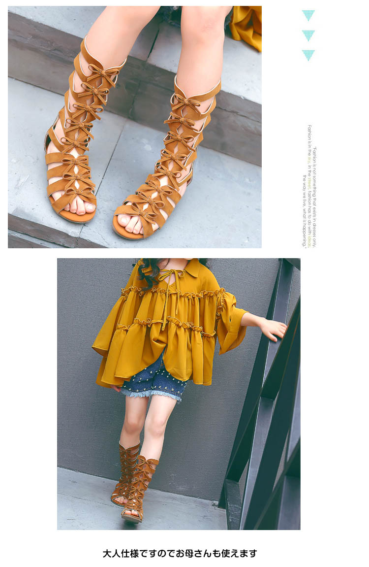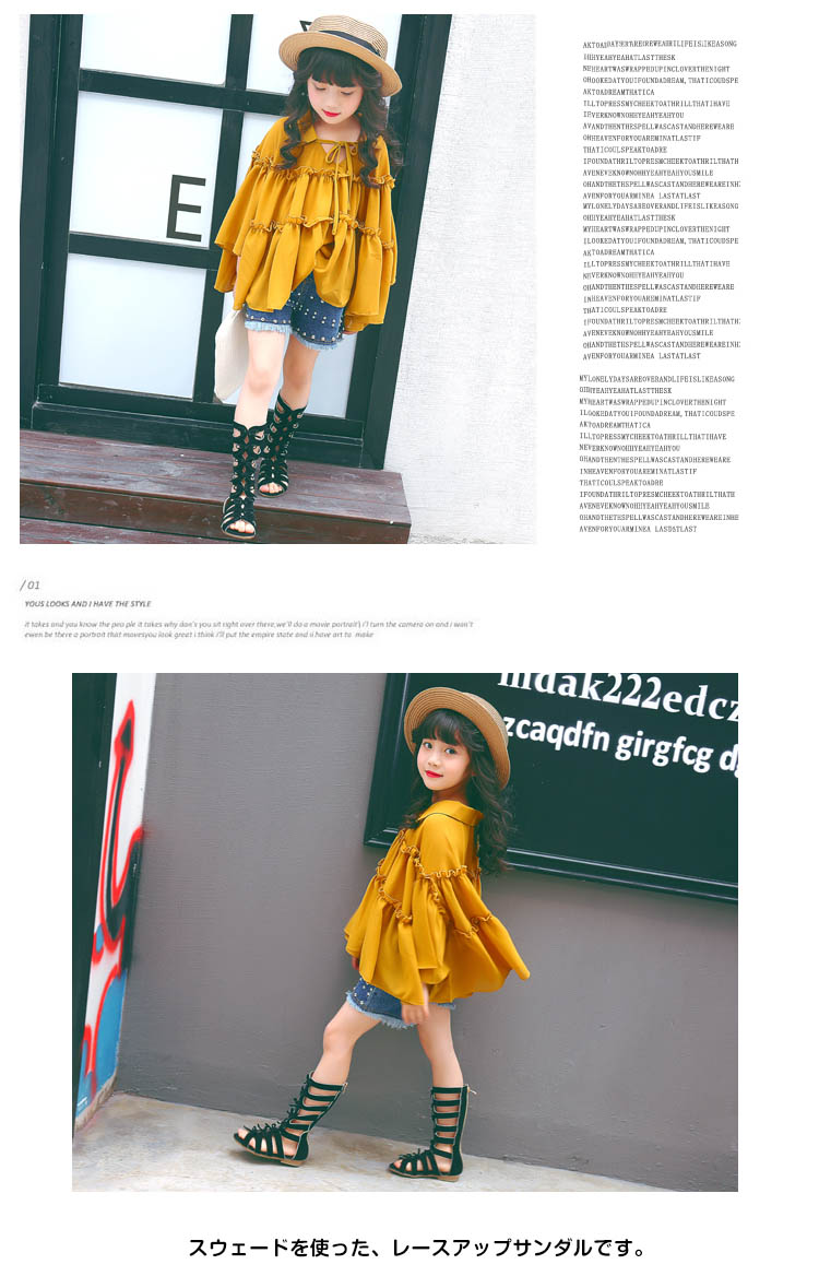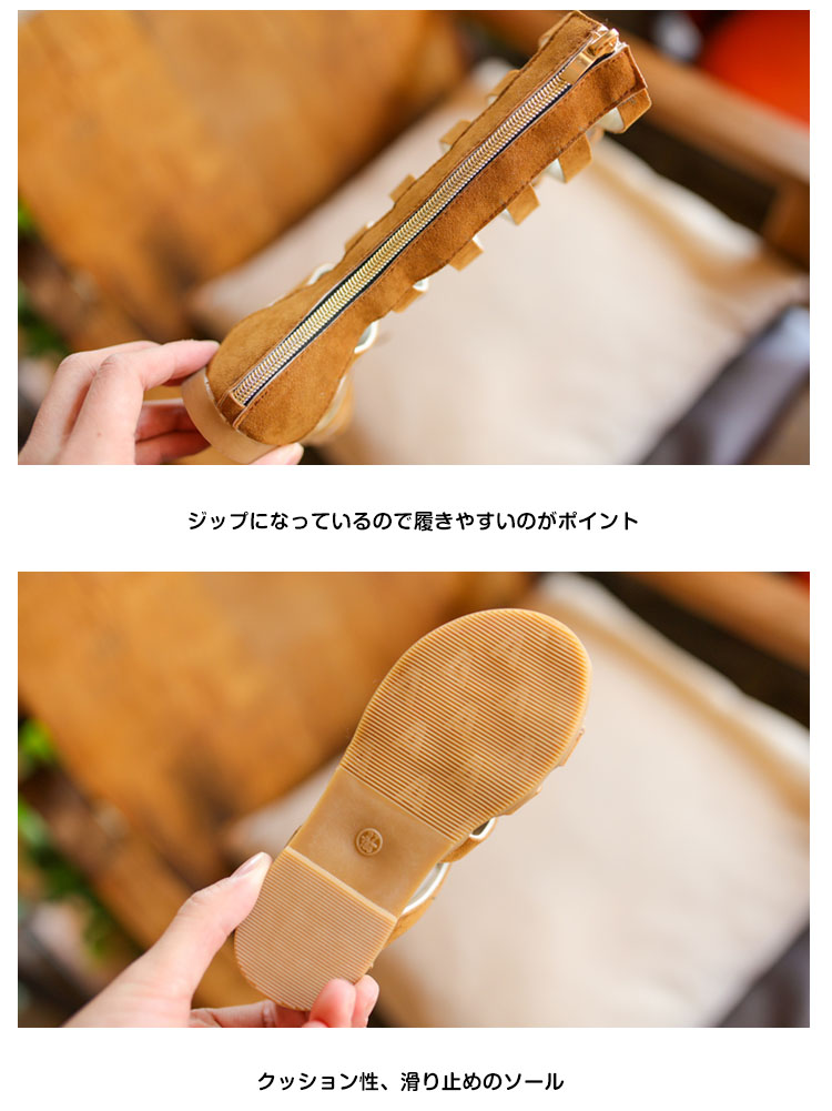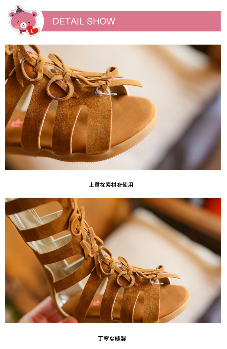 | スウェードを使った、レースアップサンダルです。紐付きですが、内側にファスナー付きですのでそのまま履けます。大人仕様ですのでお母さんも使えます | |