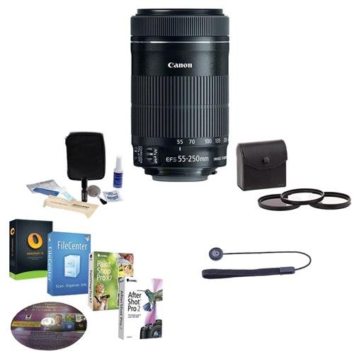 -. Title : Canon EF-S 55-250mm f/4-5.6 IS STM Lens - Bundle with 58mm Filter Kit (UV/CPL/ND2), Cleaning Kit, Cap Leash II, Pro Software Package (Includes Corel PaintShop Pro X7, Corel AfterShot Pro 2, Nuance OmniPage 18, FileCenter Standard 7)