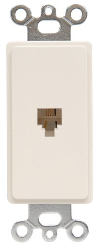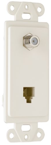 Combination f type coaxial connector and four conductor RJ11 telephone jack. With one-piece molded plate decorator outline. White.