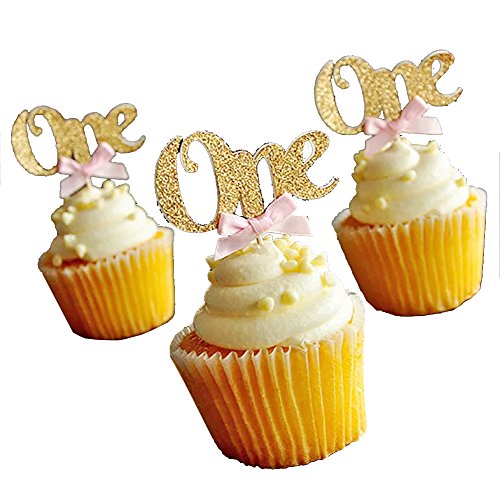 -. Title : Looching 24PCS Glitter Gold One Cupcake Topper Pink Bow 1st Birthday Anniversary Decoration