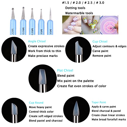 Studio : Ejiubas Publisher : Ejiubas Binding : Misc. Product Description Features: Color: Blue Package Included: -15 * Nail Art Brush -5 * Double-end Silicone Carving Brush Dotting Tool -Black Roll-up Case15 Pcs Nail Art Design Pen Painting Polish Brush Tools Set 1X Acrylic Brush:Detailing tasks as well as mixing acrylic liquid and crystal powder 2X Round Head Brushes: Drawing patterns and covering the edge of fingernail after coloring 1X Nail Phototherapy Pen Brush:Shaping when doing acrylic nails, help to make curves 1X Flat Fan Brush:For an airbrushed effect use this to streak color on the nails 2X Detailer brushes:For intricate work and delicate flowers 3X Liner Brushes: Drawing or hooking outline; Drawing flowers 2X Oblique Head Brushes: Coloring and painting for UV gel nail; Suitable for making 3D Flowers effect 2X Flat Brushes:Perfect for UV gel nail art. Help for building gel tips and useful for French manicure 1X Gradient Round Head Brush: For gradient nails and layered colors, star glitter nails 5 Pcs 2 Way Silicone Carving Brush Dotting Tool 1)Dotting Head: #1.5,#2.0,#2.5,#3.0 and one long sharp head Can be used for making dot designs and flowers, as well as mix and blend colors together in the interesting designs 2)Silicone head: Angle Chisel, Cup Round, Cup Chisel, Flat Chisel, Taper Point Can paint,apply gel,spread fine glitters powders, and sculpting acrylic nails,carve flower and make patterns on your nails Please refer to the instruction in the package for more details. 0