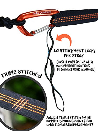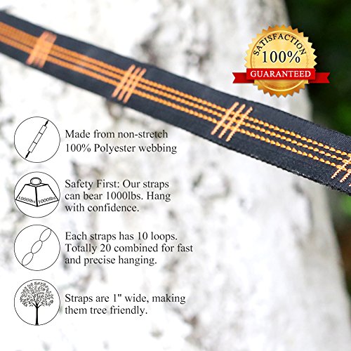 Made of 100% high quality soft silky touch, smooth and breathable woven nylon and features premium polyester non-stretch tree straps with build-in loops. It ensures you a knotless hammock and reduce your efforts on tree rope knotting, lightweight aluminum wiregate carabiners which ensures optimal weight distribution and incredible comfort, as well as durability. Reinforced edges make the material extremely tear-resistant.