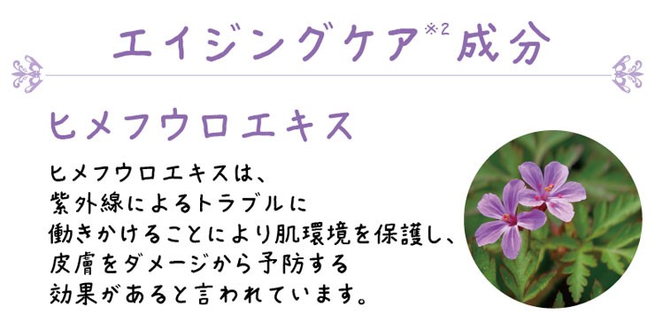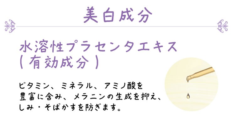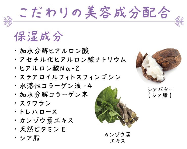 | 成分 | 水溶性プラセンタエキス、グリチルリチン酸2K、加水分解ヒアルロン酸、アセチル化ヒアルロン酸ナトリウム、ヒアルロン酸Na-2、水溶性コラーゲン液-4、加水分解コラーゲン末、シルバーバイン果実エキス、ヒメフウロエキス、カンゾウ葉エキス、スクワラン、シア脂、ステアロイルフィトスフィンゴシン、サラシミツロウ、トレハロース、天然ビタミンE、グリコシルトレハロース・水添デンプン分解物混合溶液、ジラウロイルグルタミン酸リシンナトリウム液、ソルビトール液、BG、濃グリセリン、キサンタンガム、水添大豆リン脂質、グリセリン脂肪酸エステル、SE ステアリン酸グリセリル、ステアリン酸POEソルビタン、イソステアリン酸バチル、ステアリン酸ポリグリセリル、トリエチルヘキサン酸グリセリル、グリセリンエチルヘキシルエーテル、カルボキシビニルポリマー、ベヘニルアルコール、ジメチコン、水酸化Na、フェノキシエタノール、香料 |