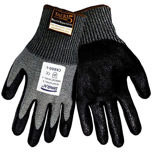 Studio : Global Glove Publisher : Global Glove Binding : Misc. Product Description Global Glove CR800 provides the latest technology in comfort and cut resistant gloves. The Samurai CR800 incorporates Taeki5 technology uses a revolutionary duracore spinning process and an innovation silicon reinforced fiber. The technology advancements in our engineered yarn bring you the exceptionally high cut resistant without sacrificing dexterity and tactile sensitivity. Specially formulated Tsunami Grip Tuff nitrile. Nitrile affords excellent oil and chemical resistance. Dexterity and comfort are the best available in this level of cut resistance. This super lightweight shell provides EN 388 level 5 and ASTM level 4 cut resistance, comfort and the ability to dip into many chemicals to retrieve sharp objects. Perfect for handling sharp objects such as sheet metal, glass or razor sharp steel. General purpose. Gray and black liner color. Coating color: black. Coating composition: nitrile palm. Smooth exterior finish. Elasticized knitwrist cuff finish. Taeki5 liner provides excellent cut resistance and dexterity. Black hides soil, extending glove wear life. Ergonomically designed forms provide naturally curved, relaxed fit to reduce hand fatigue. Provides good wet and dry grip. Applications: assembly involving small sharp components, automotive, white goods, plastics, glass. Medium size. 0
