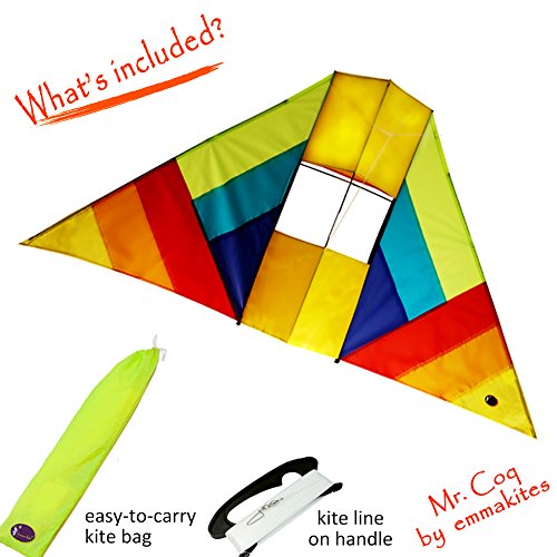 Studio : emma kites Publisher : emma kites Binding : Misc. Product Description Mr. Coq Specification What's included: Kite Sail; Kite string coiled in the handle bar; Instructions; Fabric kite bag(sleeve) Dimension of sail: 152x64cm / 60x25inch Craft: Applique technique, zigzag sewing to maintain the beauty Kite string: 100m / 320ft | test tensile strength: 45lb Wind range: 1.5~5bft / 3~25MPH Sail material: Ripstop Nylon Net weight: 120g / 4.23Oz With only 17inch packaging length, Mr. Coq will be easily to inserted into your backpack, suitcase Attention: Kids are not allowed to fly kite without adult supervision. Fly kite in an open place. Never fly the kite near high buildings, tall trees, high-voltage towers, etc. Please read the instructions and pay enough attention to precautions before flying kite. 0