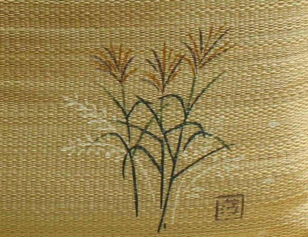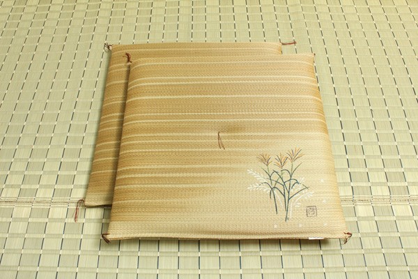 職人が1枚1枚手作業で捺染プリントを施したイ草座布団です。メセキ織という技法で柔らかい肌感触に仕上げました。またイ草の生地を縫製した後に、生地を湿らせ、裏返しにする『返し』という技法で仕上げております。イ草を通常曲げてはいけない方向に曲げますので、良い(太く強い)イ草でなければ作ることができません。返すことにより、ふっくらしたボリューム感を出しました。国産(九州産)のい草を使用しています。一本一本が太く、表皮が厚く繊維がキメ細かいので弾力性があり、耐久性に優れています。い草には空気の自然浄化作用、湿度の調節作用などがあります。また汚れにくく、使用するうちに黄金色に変化し味が出ます。い草に青森ヒバ加工を施しています(抗菌、防臭効果)。中材はウレタンをフェルトでサンドした三層構造で、適度なクッション性があります。※柄のプリントは職人が手作業で描く為、同じ色・柄であっても多少風合いが異なります。