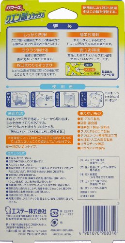 -. Binding : Health and Beauty -. Brand : STS -. EAN : 4901070908318 -. Feature : Dissolves soap scum and lime scale stains with water only / Citric Acid and polisher in the nylon fiber removes effectively / Flexible shape makes it easy to clean hard-to-reach areas -. IsAdultProduct : 0 -. Label : Mii Strategy Inc. -. Manufacturer : Mii Strategy Inc. -. Model : BU02P04882 -. MPN : BU02P04882 -. NumberOfItems : 1 -. PackageQuantity : 1 -. PartNumber : BU02P04882 -. ProductGroup : Health and Beauty -. ProductTypeName : HEALTH_PERSONAL_CARE -. PublicationDate : 2016-09-12 -. Publisher : Mii Strategy Inc. -. ReleaseDate : 2016-09-09 -. Studio : Mii Strategy Inc. -. Title : ST Powers Citric Acid Scrubber, 1 Count