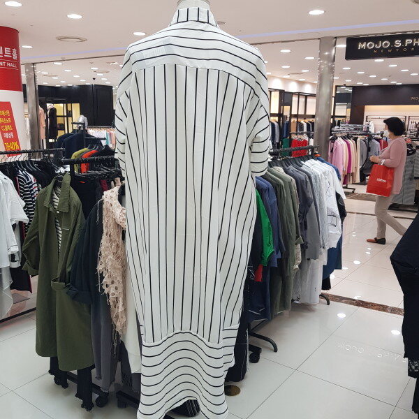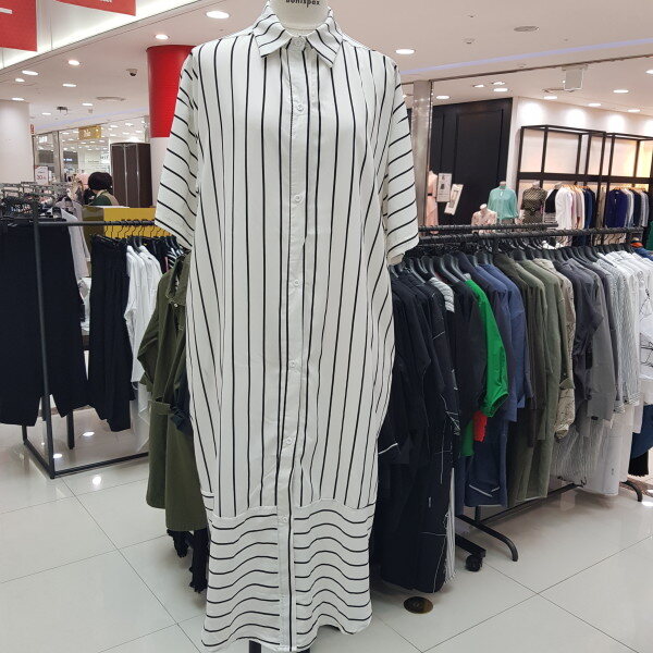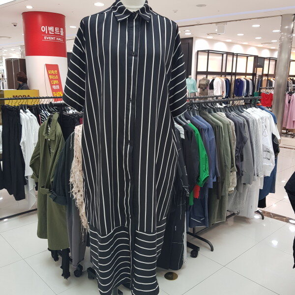 세로 스트라이프로 디자인된 롱 카라 원피스입니다.심플하며 일자라인으로 디자인되었답니다.