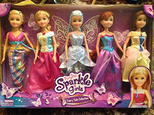 The Funville Sparkle Girlz Fairy Tale Collection makes a wonderful birthday or holiday gift. It includes five adorable dolls with exchangeable outfits for added fun. This collection is sure to help encourage imaginative play and wonderful adventures. The set of Sparkle girls' dolls have hair that can be combed and articulated limbs for posing.