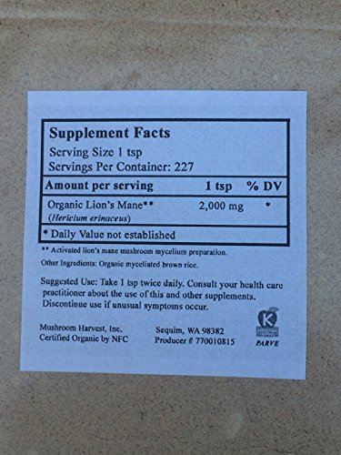 Studio : Mushroom Harvest, Inc Publisher : Mushroom Harvest, Inc Binding : Health and Beauty Product Description Lions Mane Mushroom Powder by Mushroom Harvest, Inc. 1 lb.(454g)*USDA Certified Organinc* Legend has is, that those who consumed Lion's Mane would have the memory of a lion and nerves of steel. This mushroom has been used in China and Japan as a medicinal mushroom as well as for culinary use. *Excellent to cook with or put in smoothies, juices, coffee, or tea! Make your own capsules.*PLEASE SEE 2ND PRODUCT PICTURE TO VIEW THE BACK LABEL** These statements have not been evaluated by the FDA. These products are not intended to diagnose, cure, treat, or prevent any disease. 0